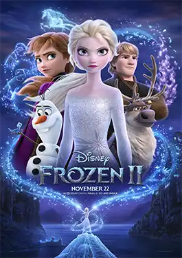 Frozen II (2019) ผจญภัยปริศนาราชินีหิมะ : เรื่องราวของการผจญภัยของ เอลซ่า (ไอดิน่า เมนเซล) ที่กำลังเดินทางสู่ผืนป่าอันกว้างใหญ่ โดยเป้าหมายของเธอคือการค้นหาคำตอบว่า "ทำไมเธอถึงได้เกิดมาพร้อมกับพลังวิเศษ?" โดยมีเจ้าหญิงอันนา (คริสเตน เบลล์) ร่วมเดินทางเคียงข้างโดยไม่ปล่อยให้พี่สาวของเธอต้องต่อสู่เสียงลำพัง